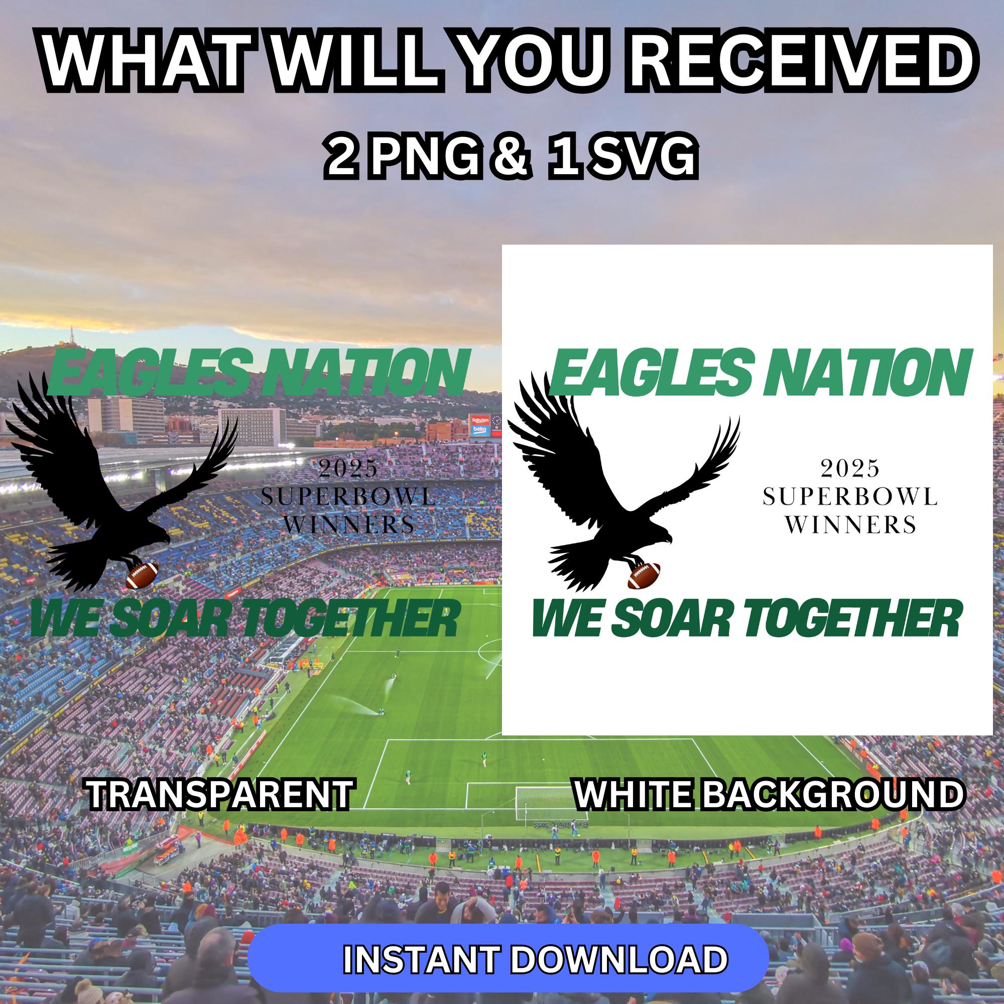 Celebrate the Philadelphia Eagles’ historic 2025 Super Bowl victory with this high-quality digital design! Featuring a bold championship theme with the phrase “We Soar Together,” this PNG and SVG file is perfect for T-shirts, mugs, posters, stickers, and more.