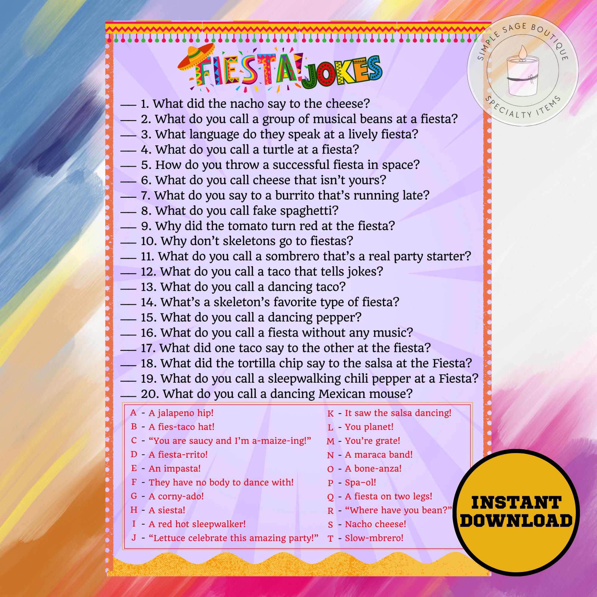 Add some flavor to your party or lesson plan — download your Fiesta Jokes for Kids today and turn your celebration into a laughter-filled fiesta! 🌟