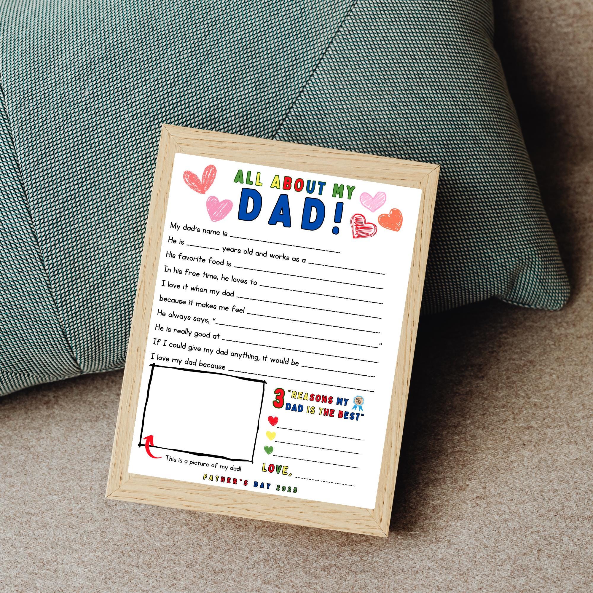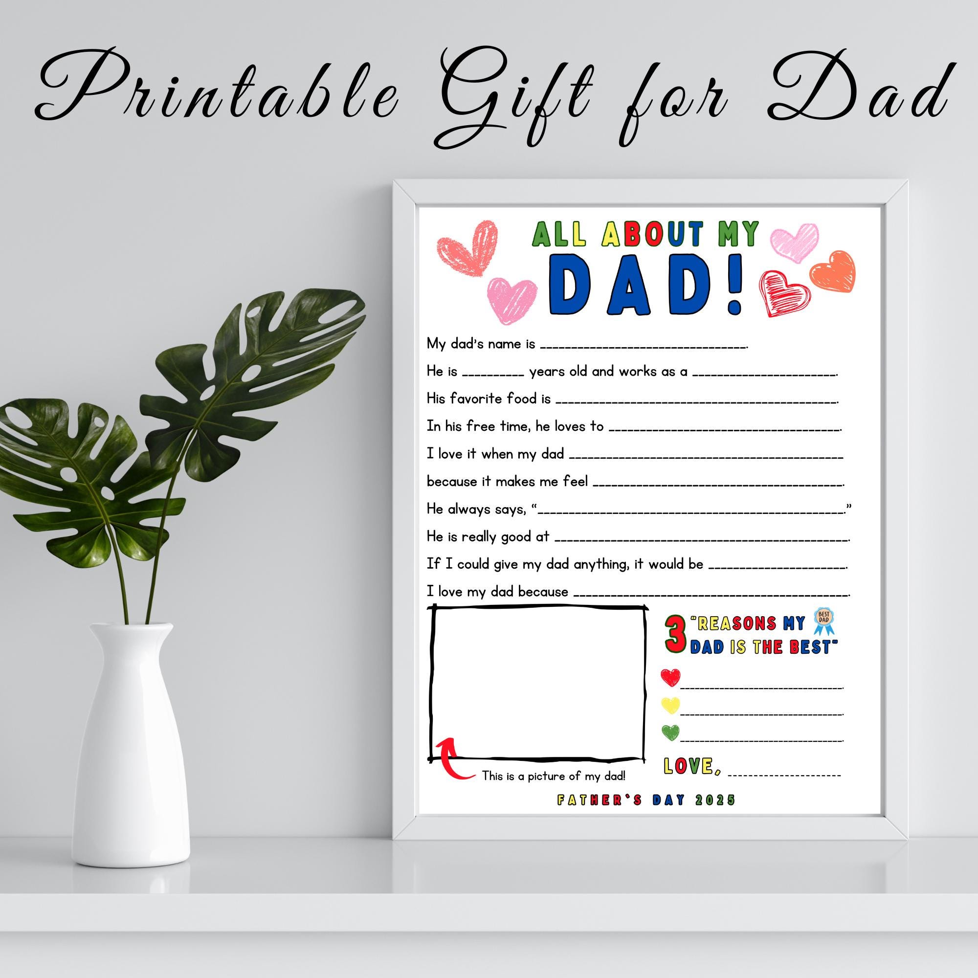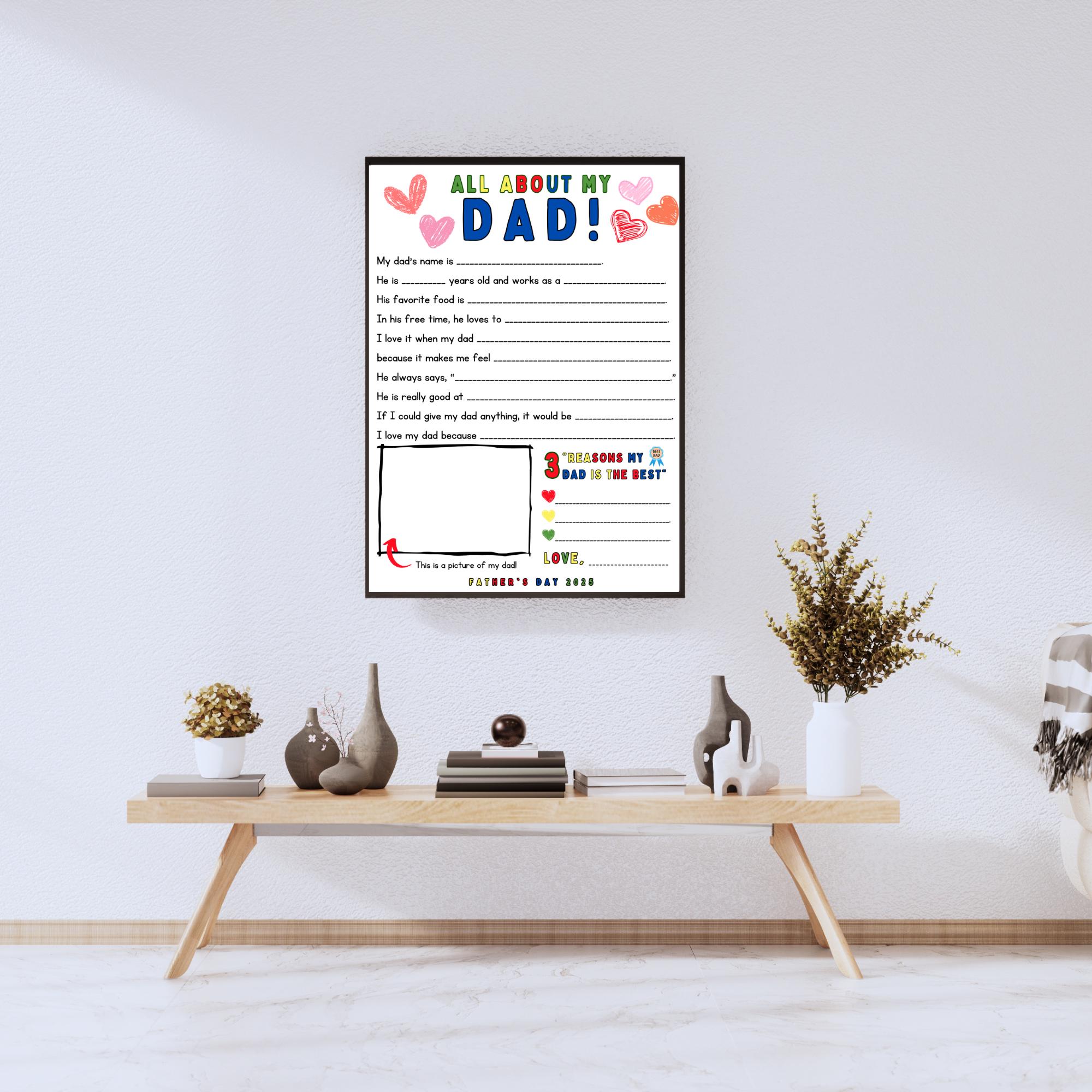 Create a heartfelt keepsake with this fun and easy DIY Father's Day craft! This printable "All About My Dad" questionnaire lets kids fill in the blanks with their own sweet and funny answers. Perfect for classroom activities, at-home crafts, or last-minute gifts from little ones.