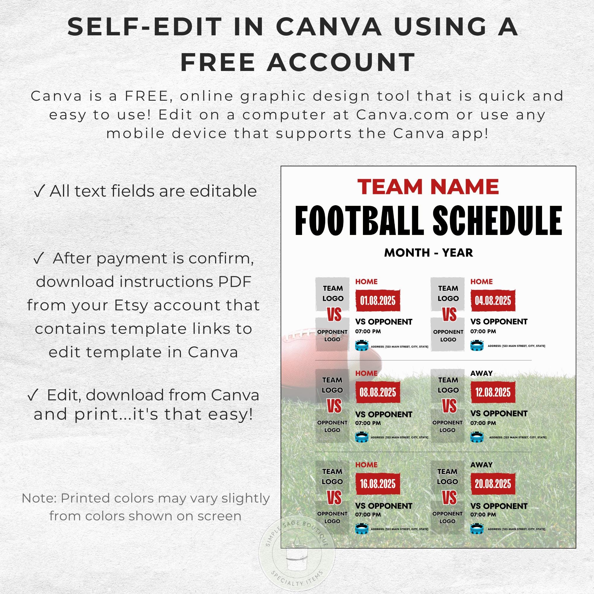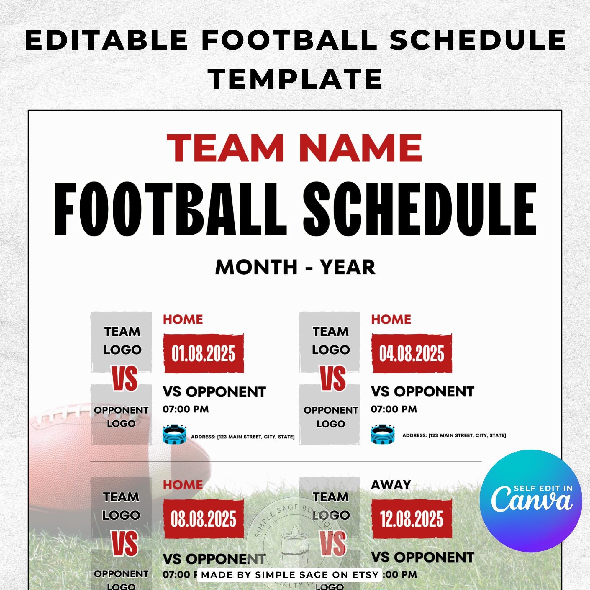 Editable Football Schedule Template: Custom Team Planner (Digital Download)