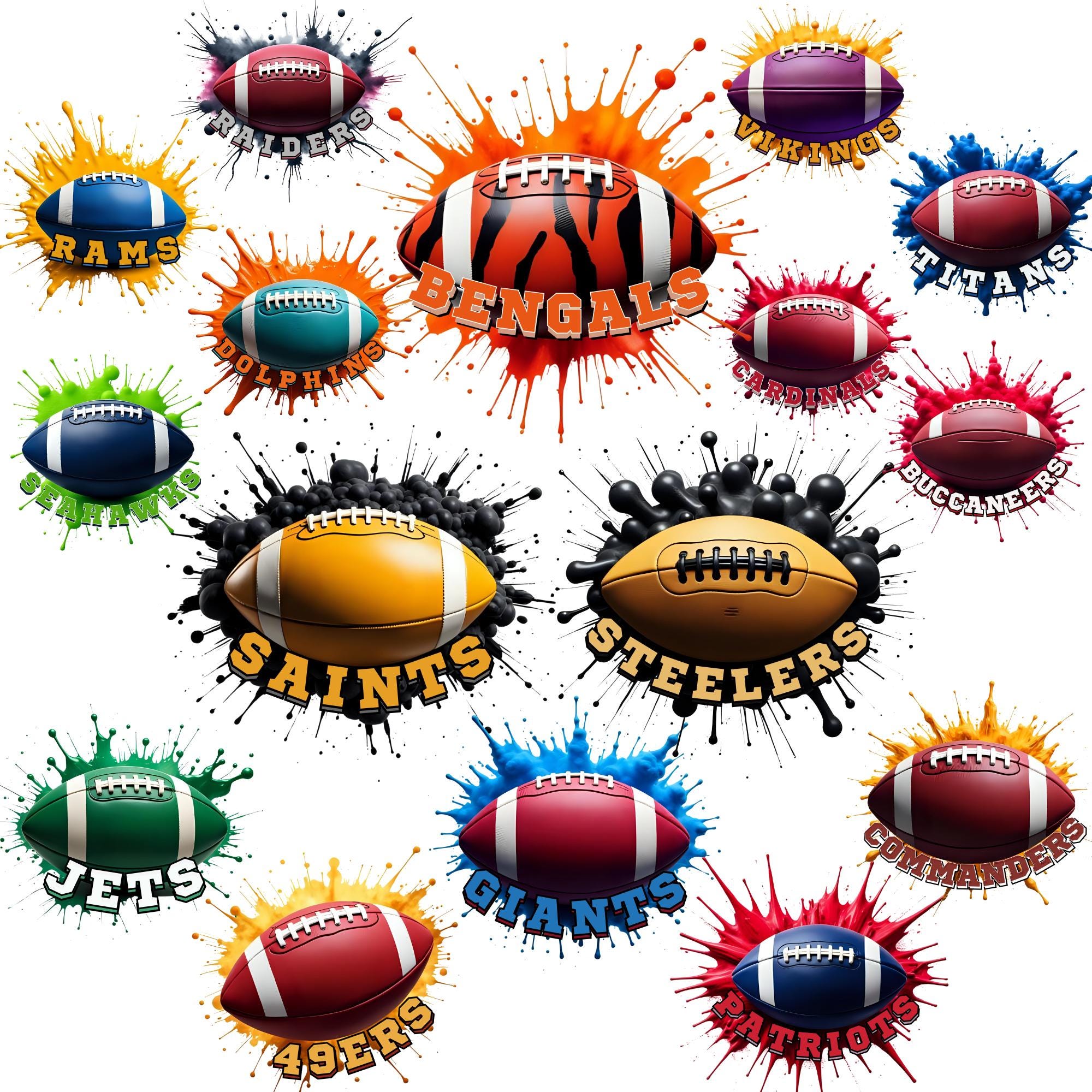 This digital pack includes 32 football ball designs with colorful splash effects inspired by different team color themes. Perfect for sublimation, t-shirts, mugs, posters, and more!