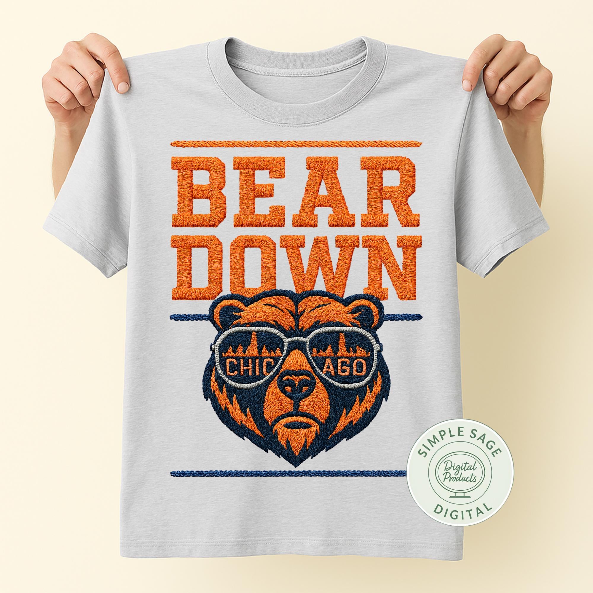 Instantly download this Chicago Bears inspired “Bear Down” design featuring a stylized bear head wearing sunglasses that reflect the Chicago skyline. Perfect for crafting your own custom apparel, decals, stickers, and more, this high-quality digital art comes in both scalable SVG and PNG formats with transparent backgrounds.