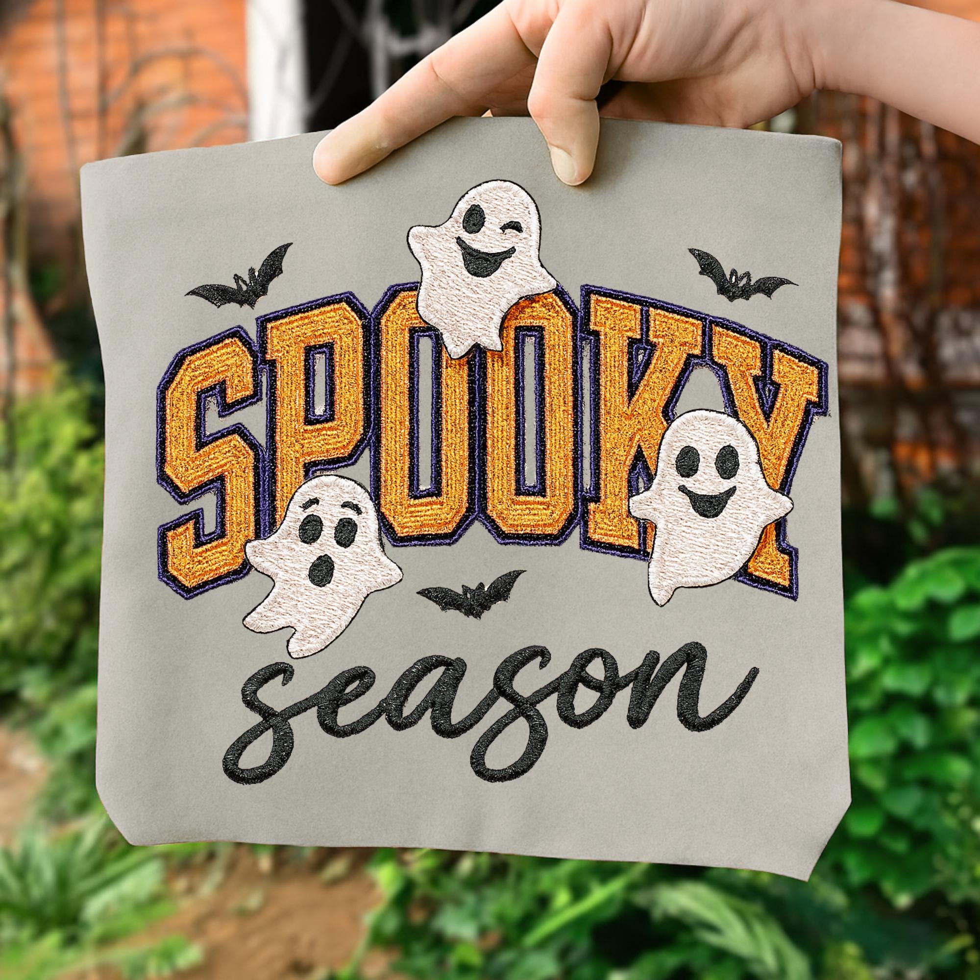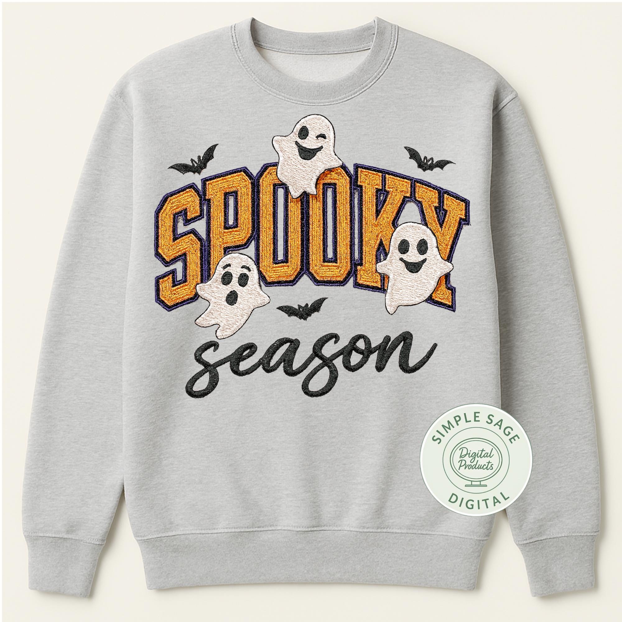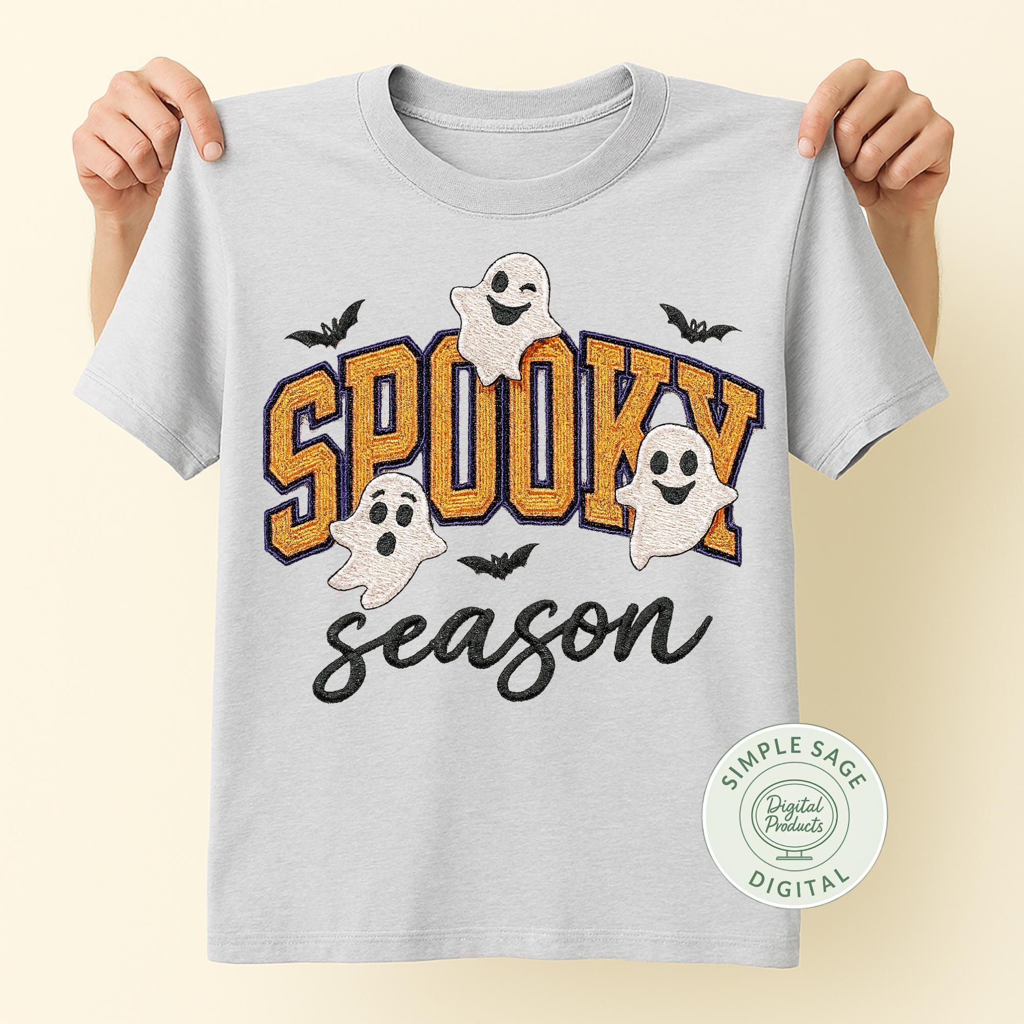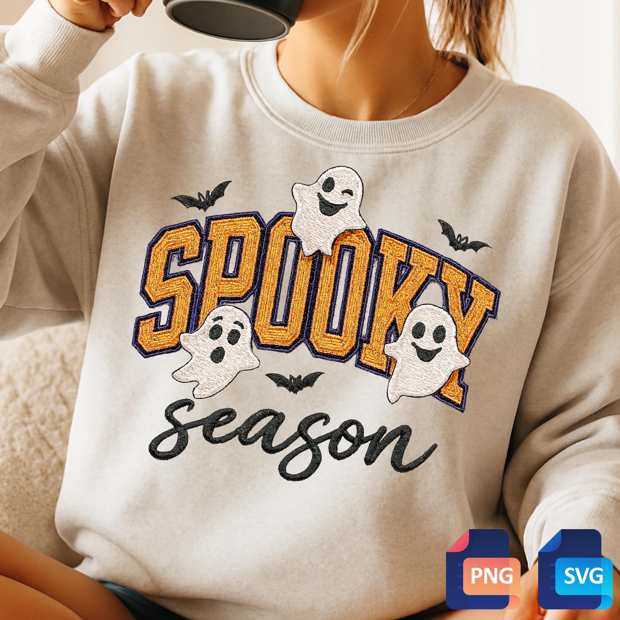 This playful Halloween PNG features bold orange “SPOOKY” lettering with a purple outline, three cheerful ghost clipart characters, fluttering cute bats SVG accents, and “season” in a flowing script. Perfect for adding a fun, festive touch to your Halloween shirt design, trick or treat tote bag, fall sublimation design, or autumn harvest graphic projects.
