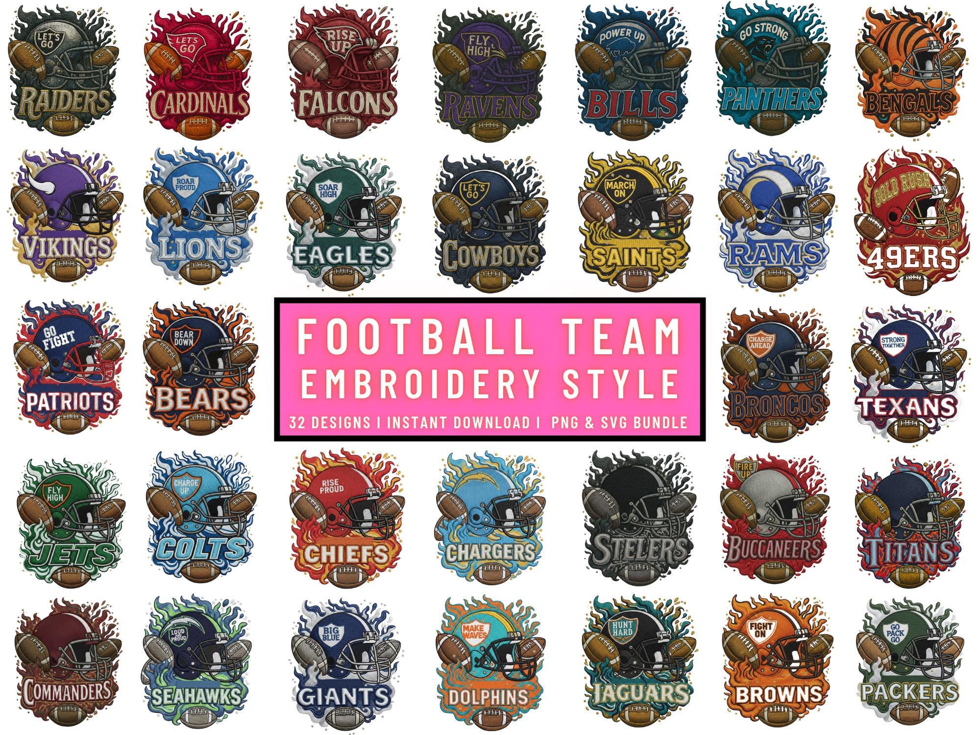 Whether youâre making custom t-shirts, mugs, decals, or wall art, this bundle gives you 32 high-quality football team style designs in both SVG and PNG formats â clean, crisp, and ready to use.
