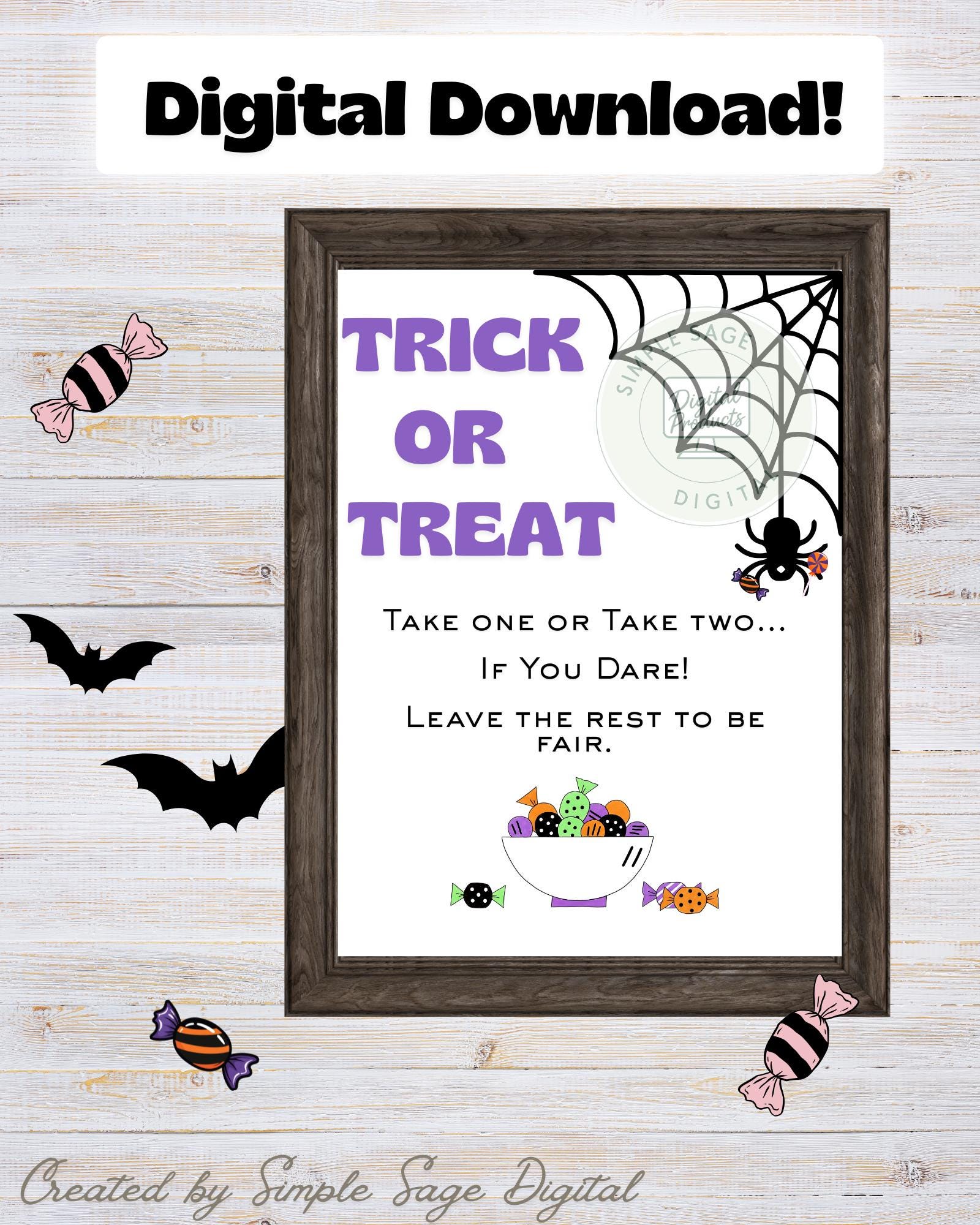 🎃 Need a Halloween sign fast? Instantly download, print, and display this cute Trick or Treat sign in minutes — perfect for your candy bowl, front porch, or Halloween party table!