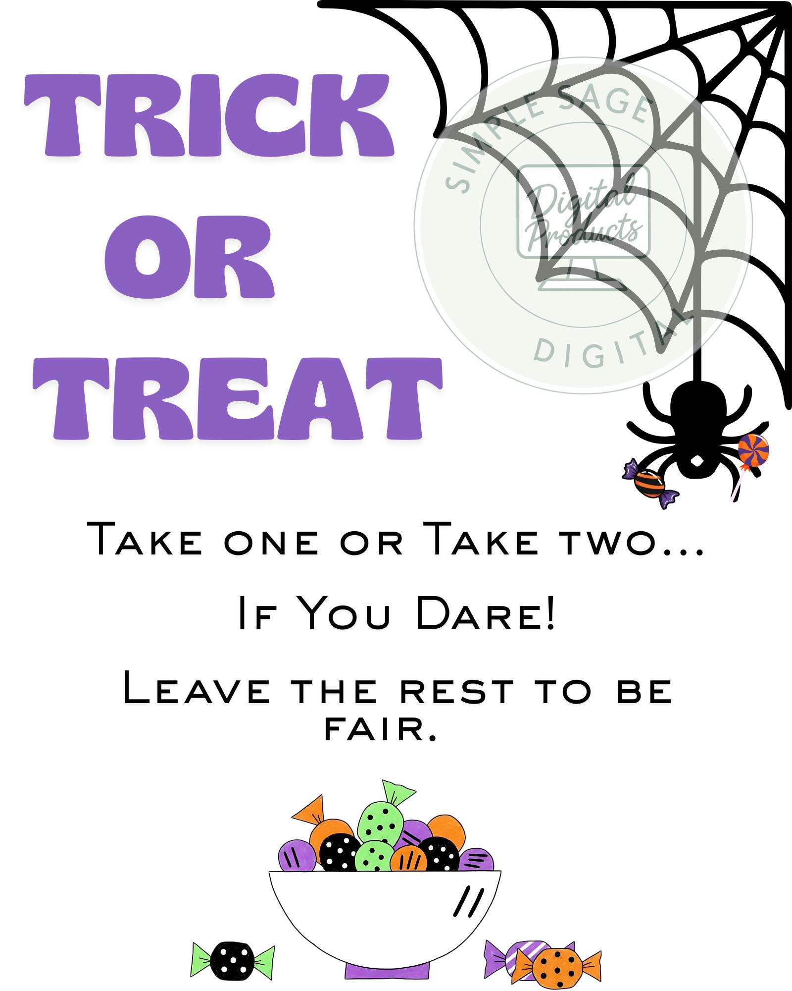 Welcome trick or treaters to your front door with this Halloween sign. It offers them to take one or two sweet treats and to leave the rest for others! If you are out trick or treating with your own little ones or out celebrating yourself. This is the perfect print to leave on your porch with a bowl of candy or treats!