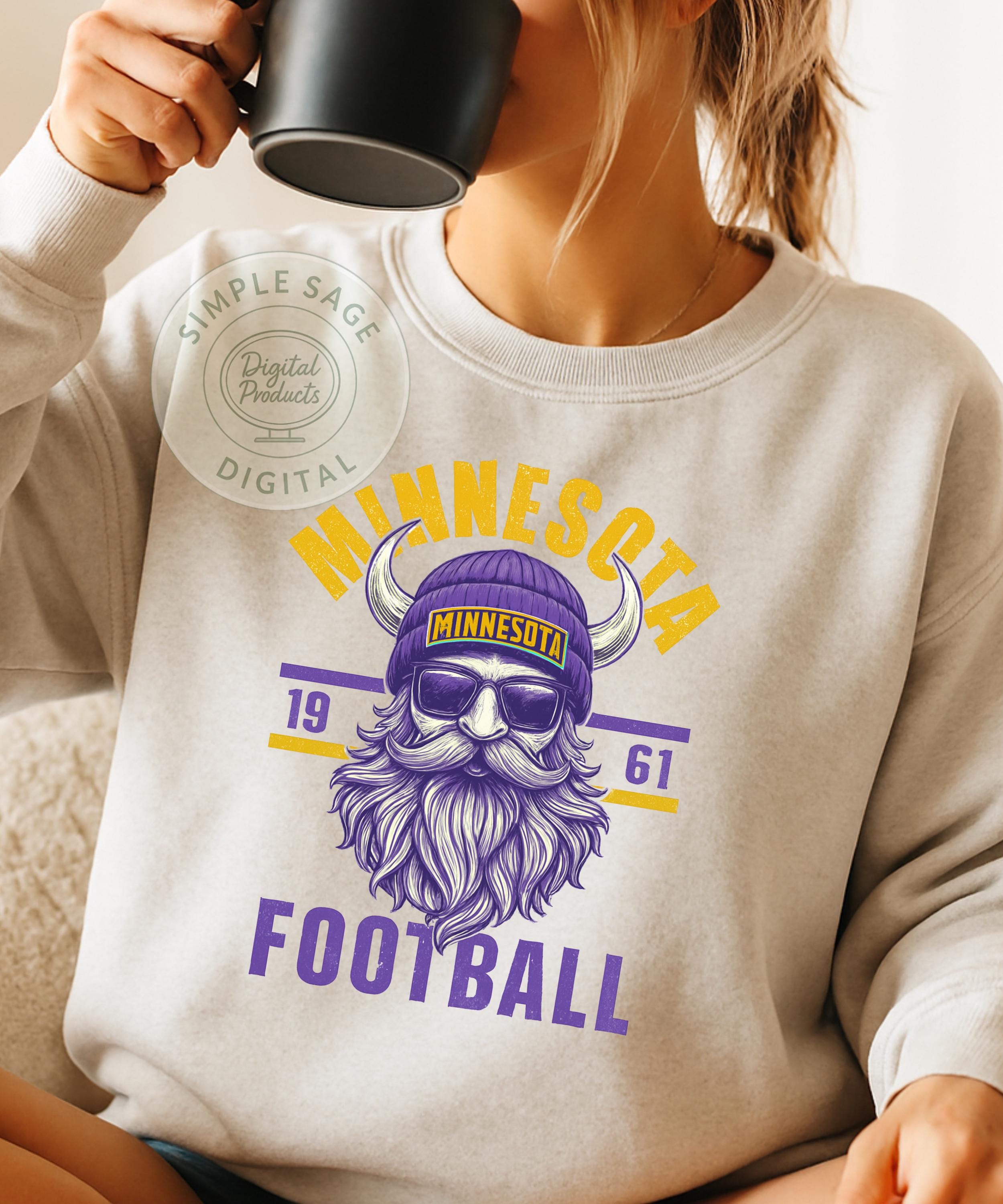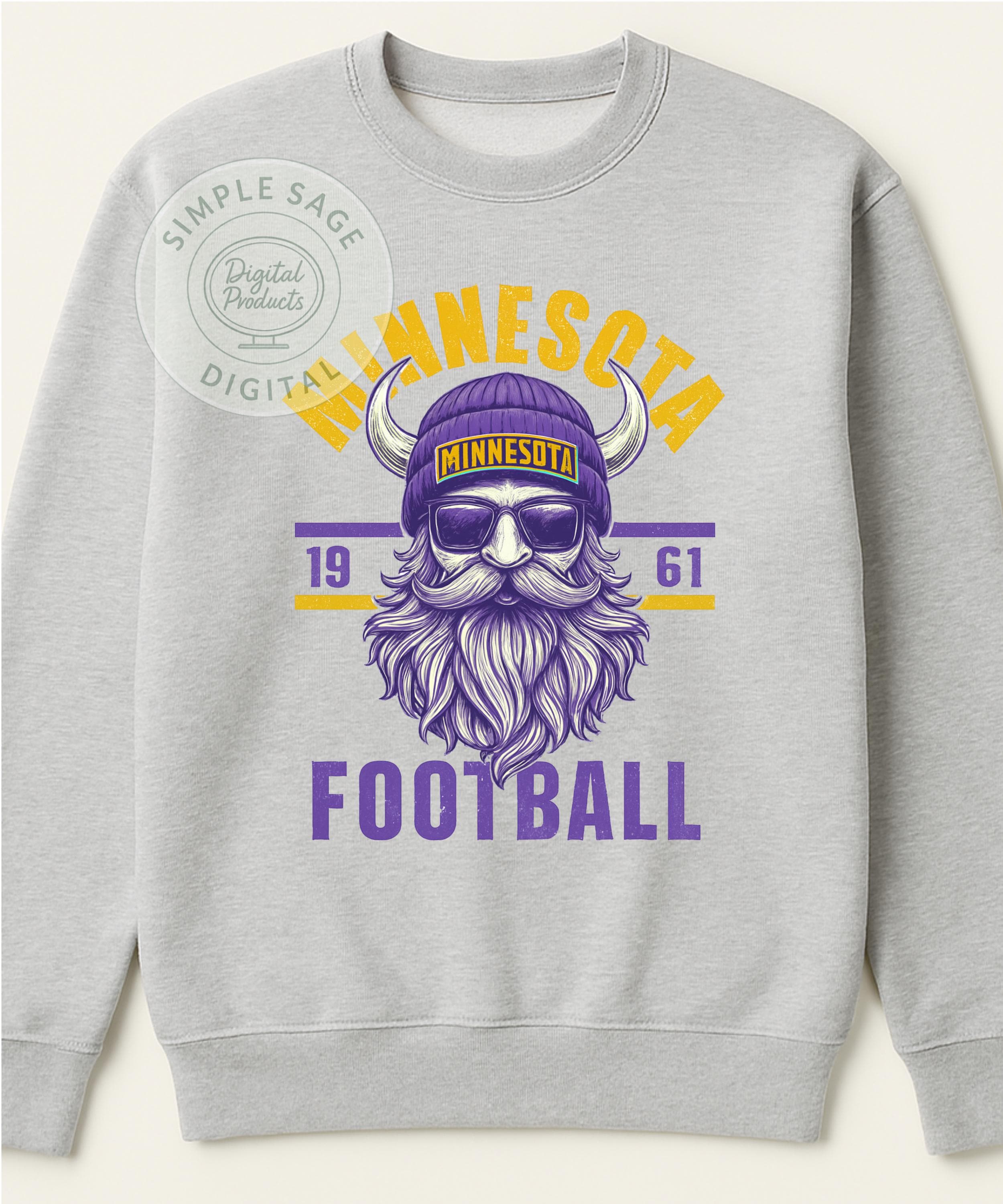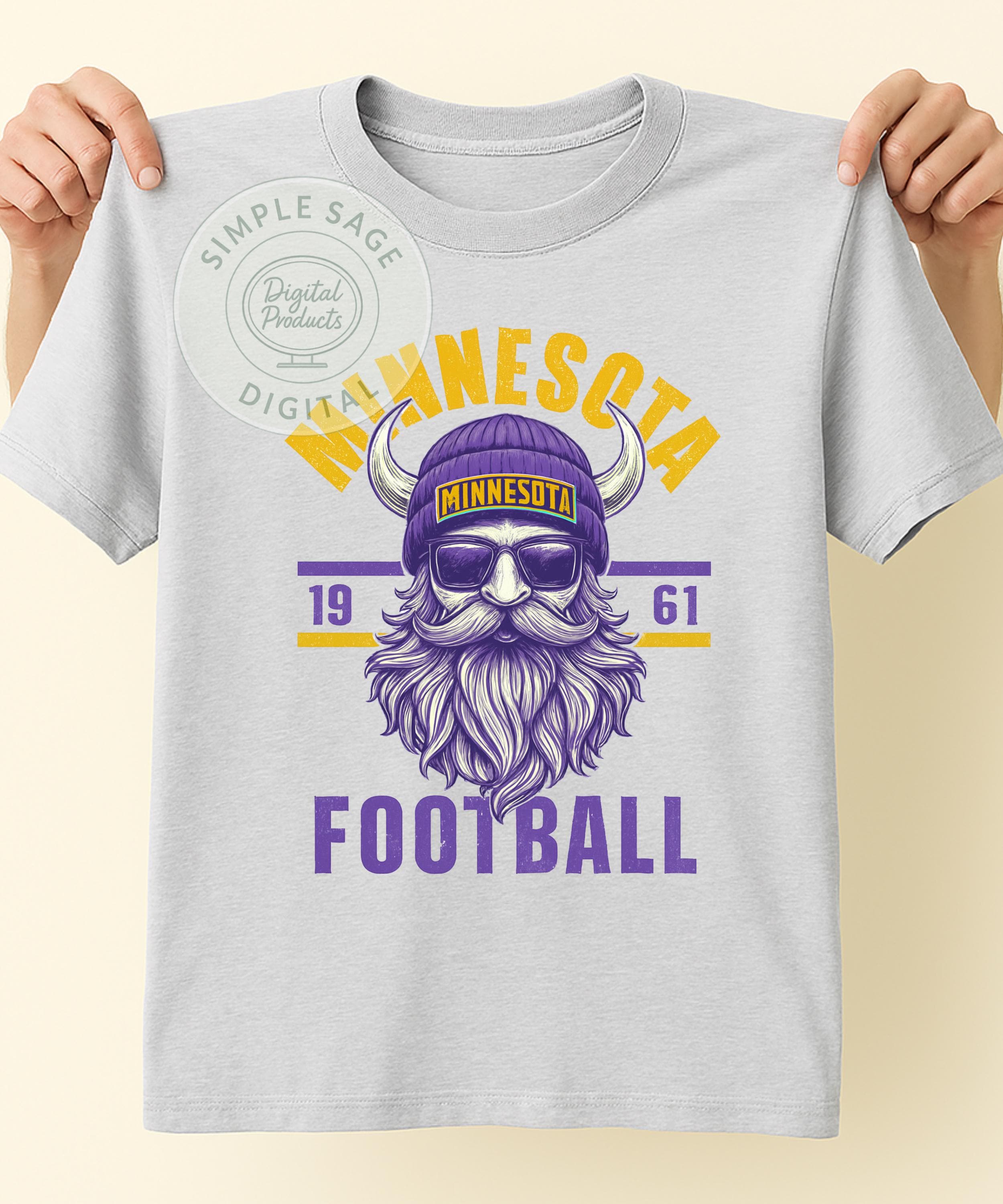 Step up your fan apparel with our cool, vintage-inspired Minnesota Football shirt. Featuring a detailed illustration of a bearded Viking donning a beanie, sunglasses, and classic horns, this design perfectly blends modern hipster style with iconic Viking imagery. The distressed purple and gold print gives it a retro, worn-in look, and the included '1961' detail pays homage to the team's historic roots. This is the ultimate tee for the fan who wants to stand out from the crowd!