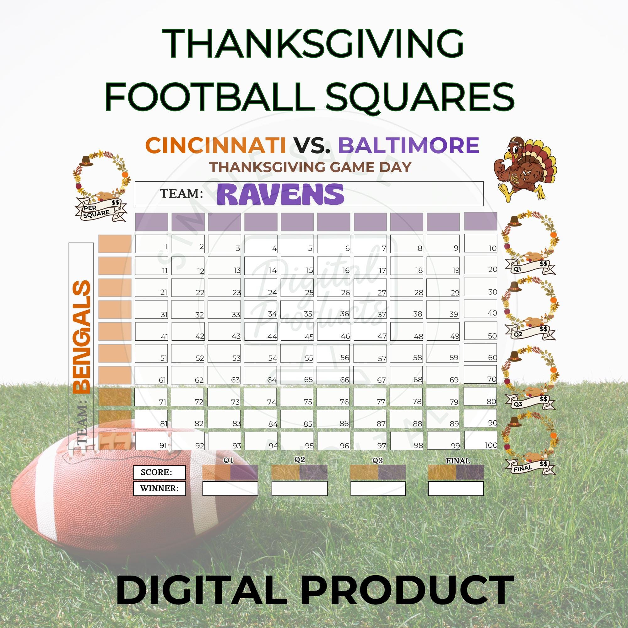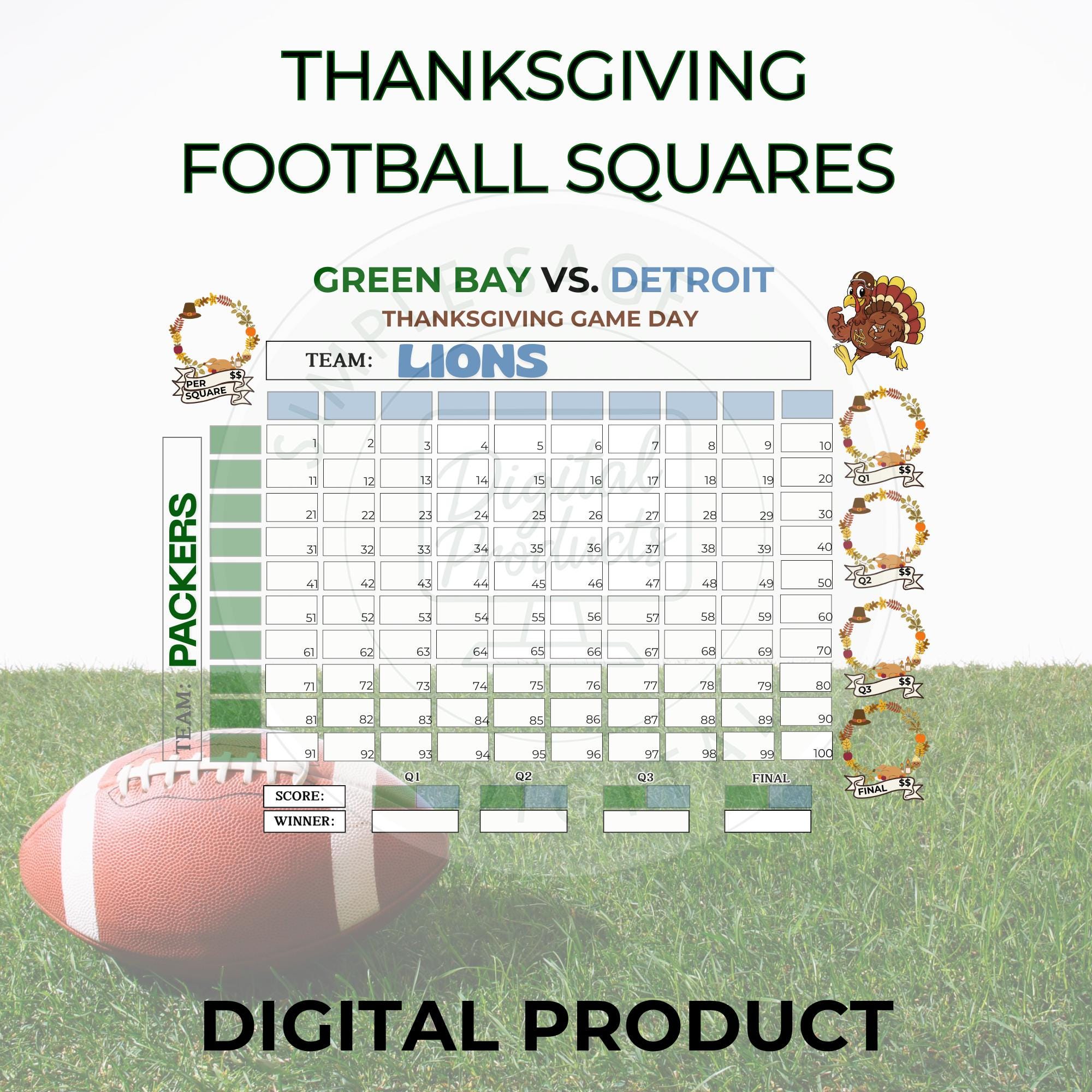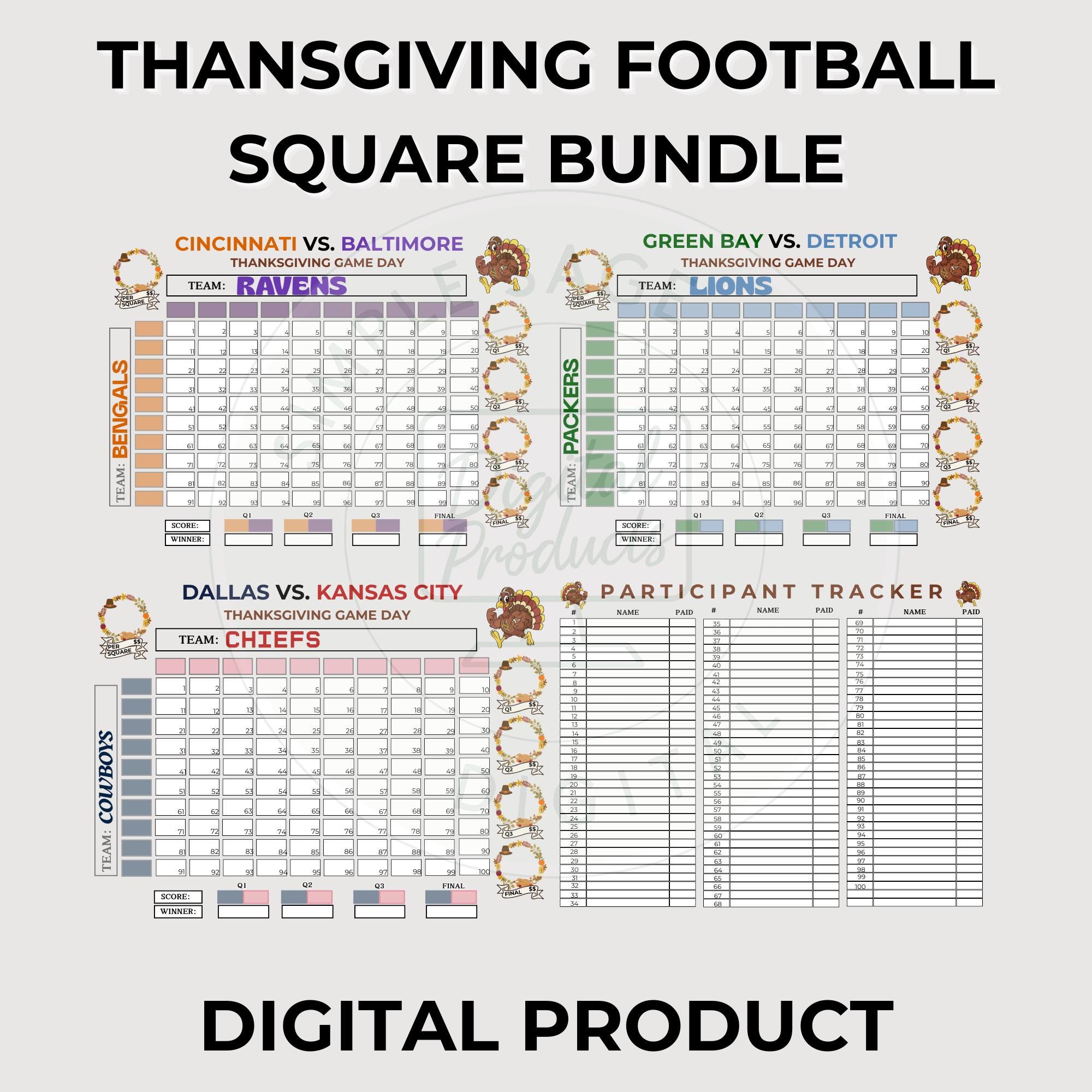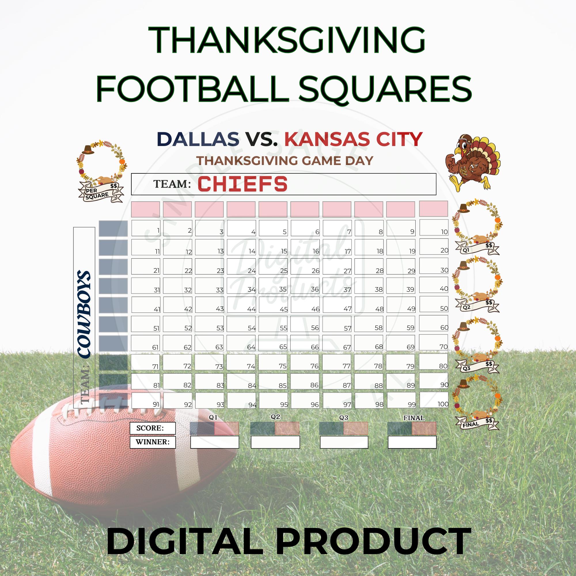 Thanksgiving Football Squares Game Bundle of 3: 100 square football pool (Instant Download, PDF)