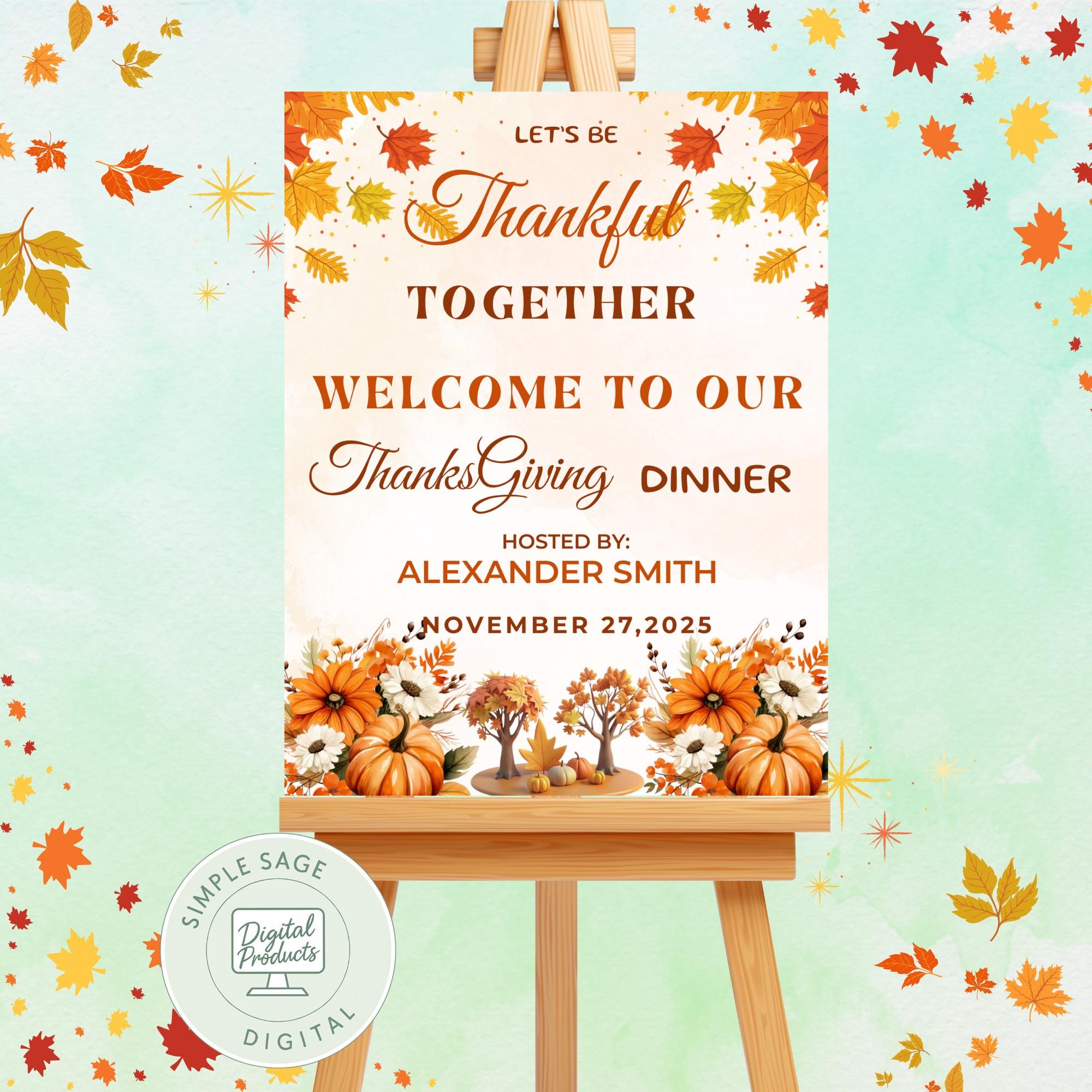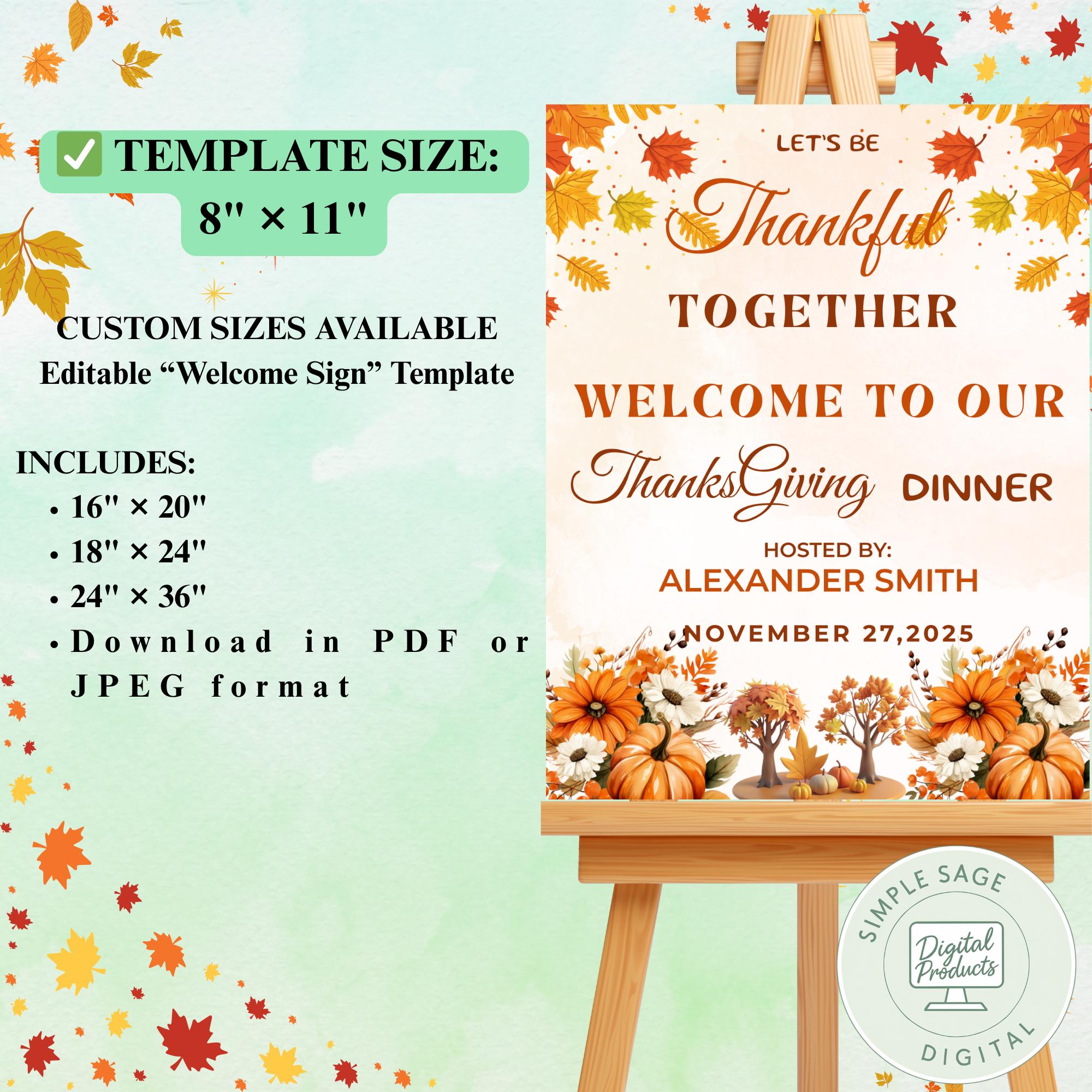 Create a warm and inviting atmosphere for your holiday gathering with this Printable Thanksgiving Welcome Sign. Designed with rich autumn tones and a heartfelt “Thankful Together” message, this editable sign is perfect for welcoming family and friends to your Thanksgiving dinner, Friendsgiving celebration, or fall party. Whether you're hosting a cozy home gathering or a large festive event, this beautifully crafted wall décor sets the mood and makes your entryway feel extra special.