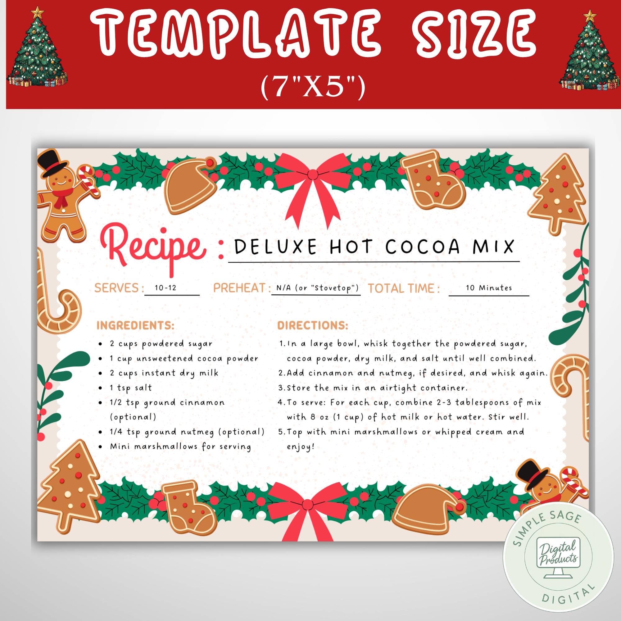 Easily create charming and personalized recipe cards for your holiday gatherings, cookie exchanges, or as a thoughtful gift with this fully editable 5x7 template. Featuring classic gingerbread and festive greenery, this design is perfect for sharing your favorite Deluxe Hot Cocoa Mix or any recipe!
