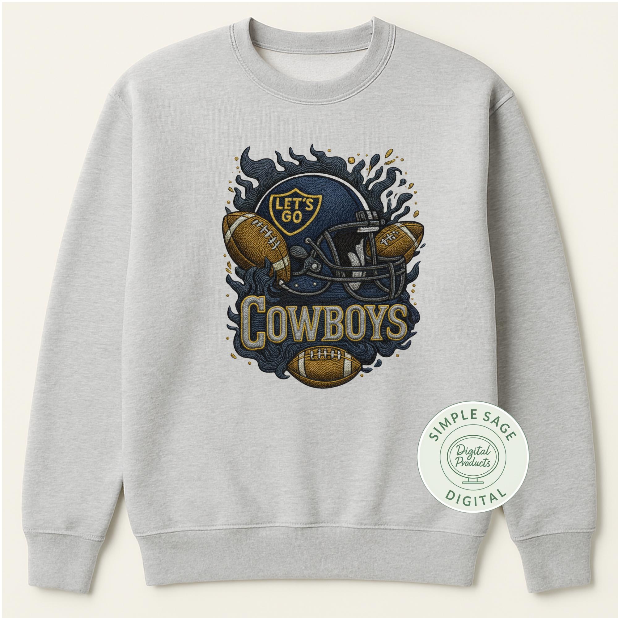 Bring your team spirit to life with this high-resolution, fan-designed Cowboys football helmet clipart. Perfect for crafting custom t-shirts, decals, mugs, banners, party invites, and more, this dynamic illustration features a dark blue helmet, three classic footballs, flames, and bold metallic lettering—all delivered as ready-to-use PNG and scalable SVG files.