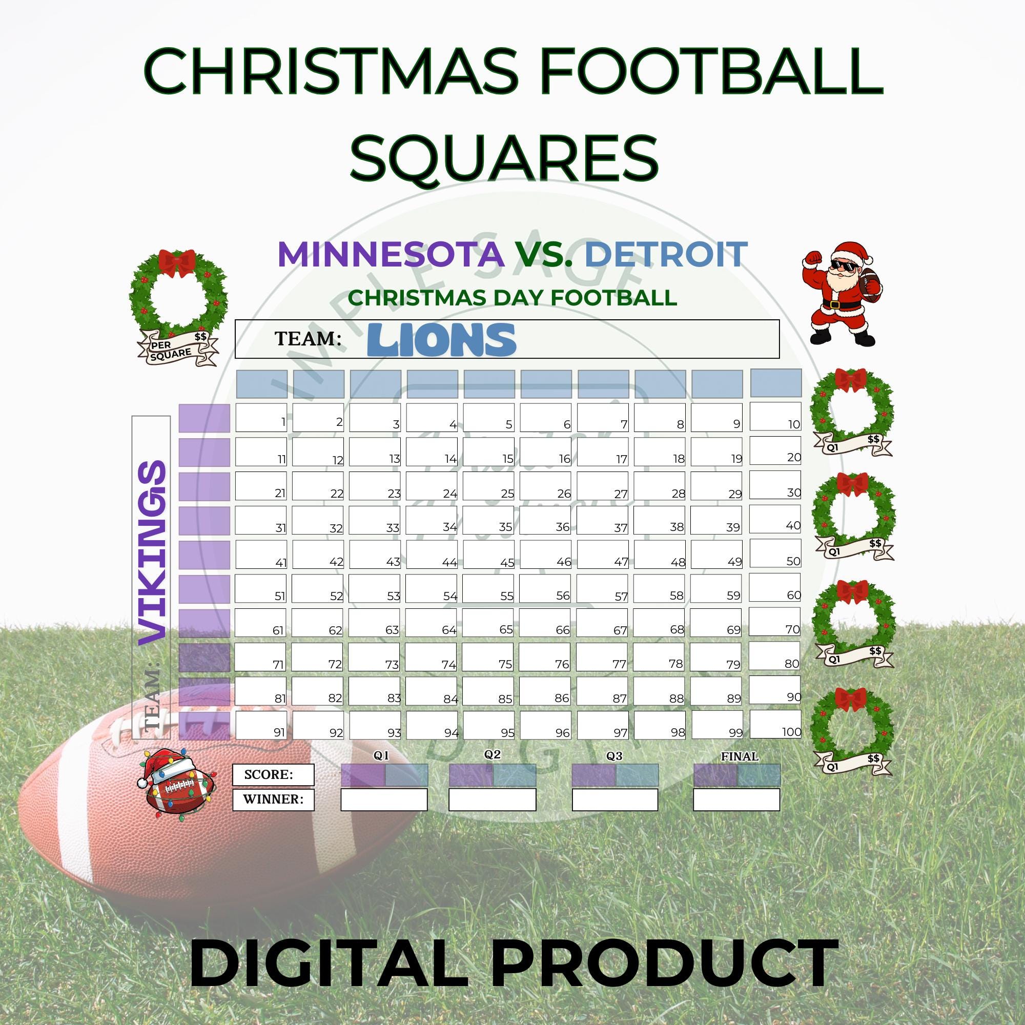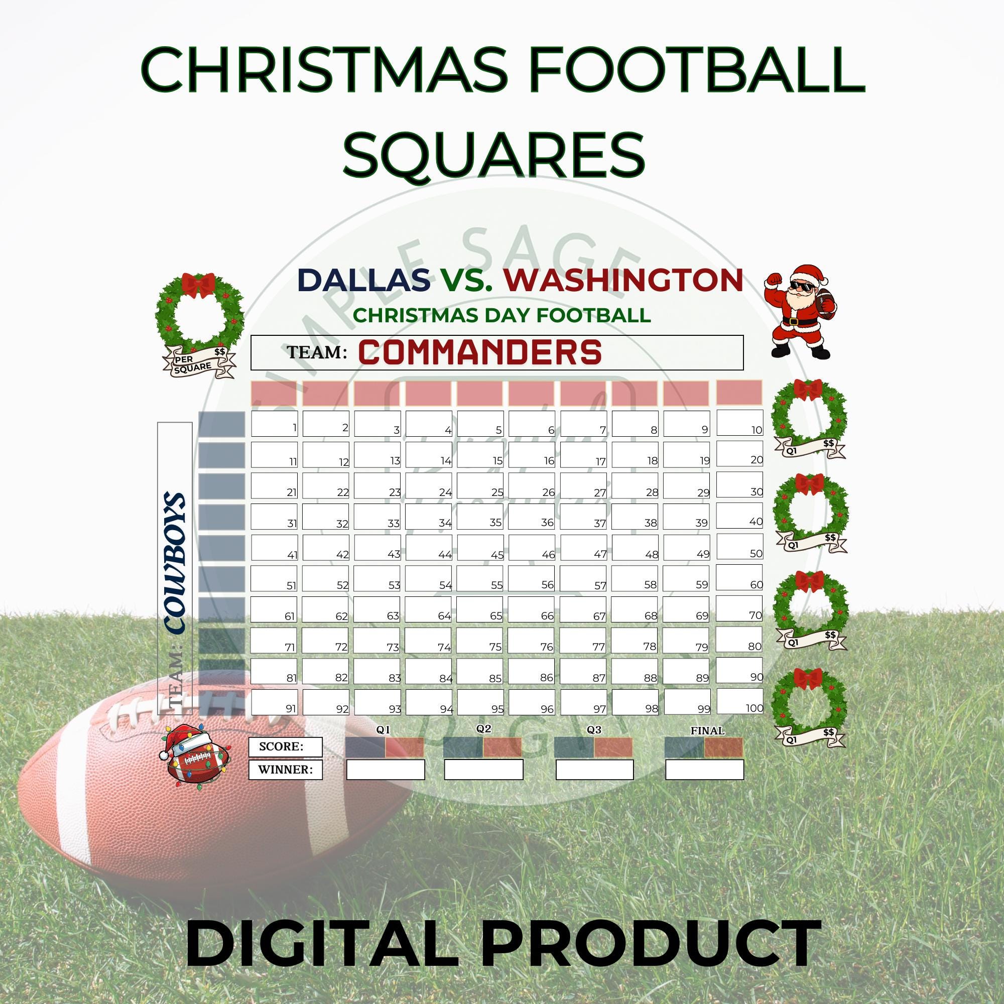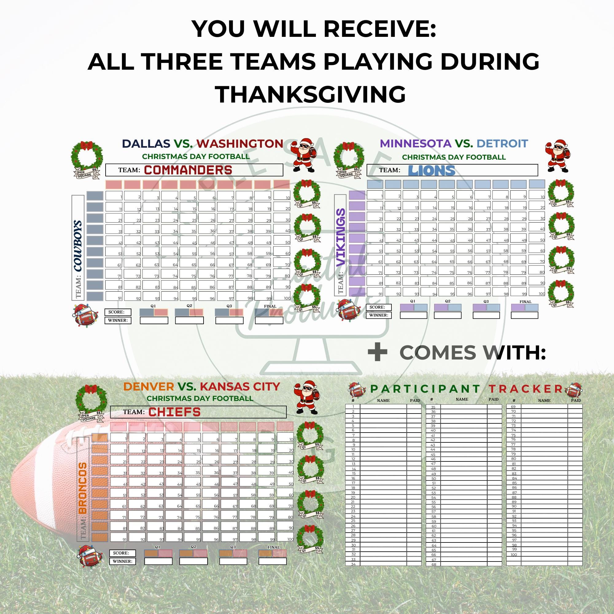 Christmas Football Squares, 100 Square Grid, Tracker (PDF Download)