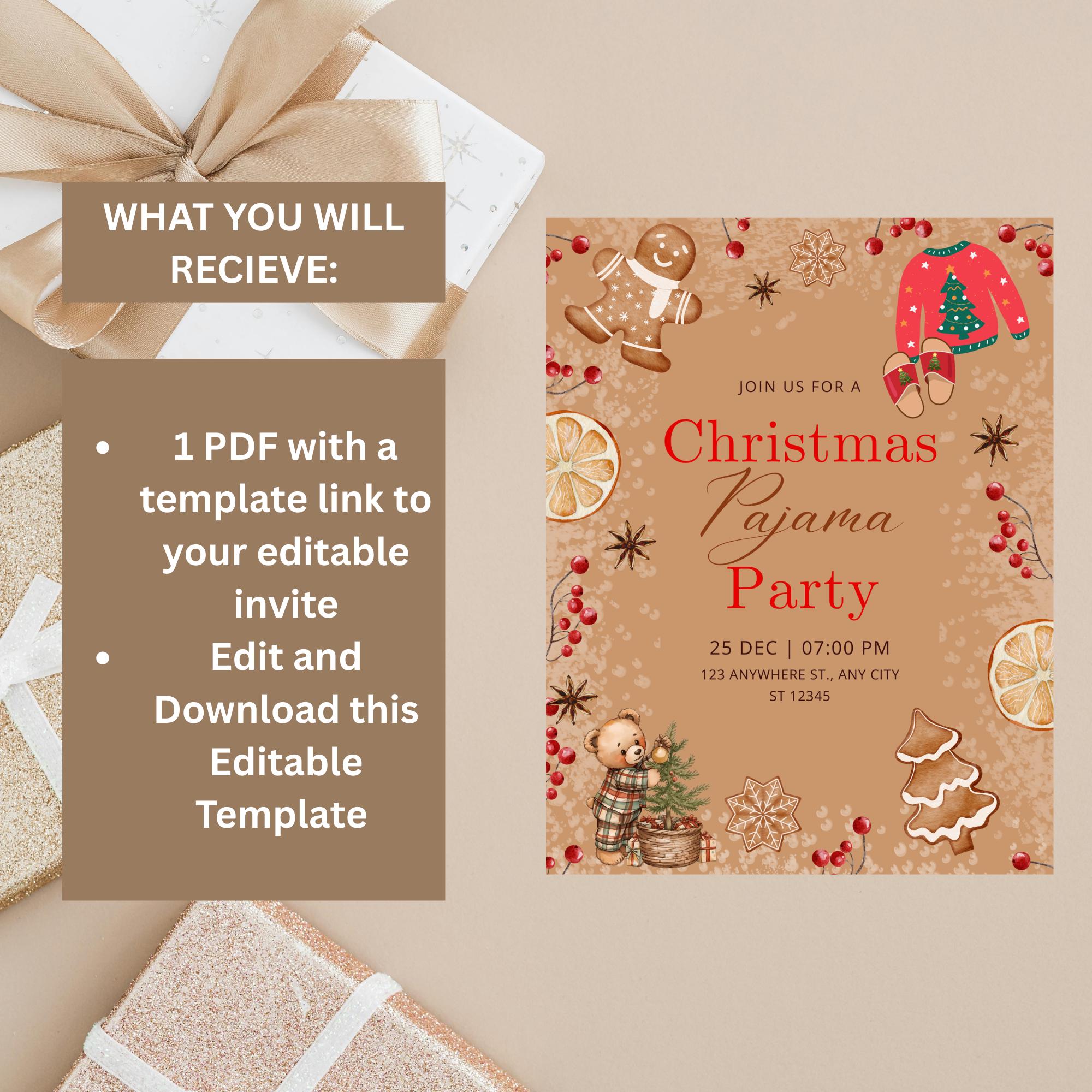 Celebrate the holiday season in style with this modern and minimalist Christmas Pajama Party Invitation. Perfect for office parties, children's parties, family gatherings, or festive get-togethers, this editable Christmas party invite template makes it easy to personalize your event details in Canva. Simply edit, download, and send digitally or print at home for a professional finish.