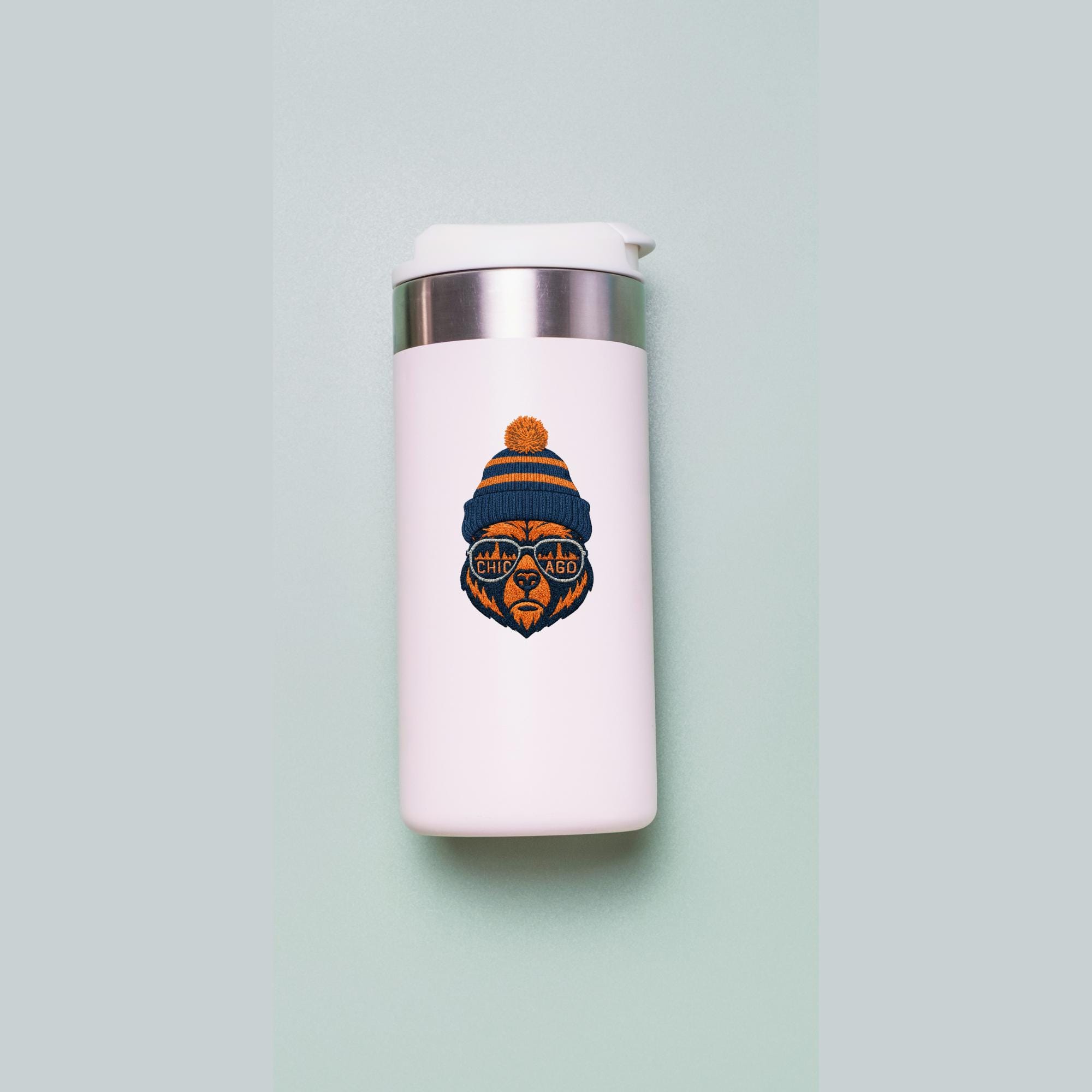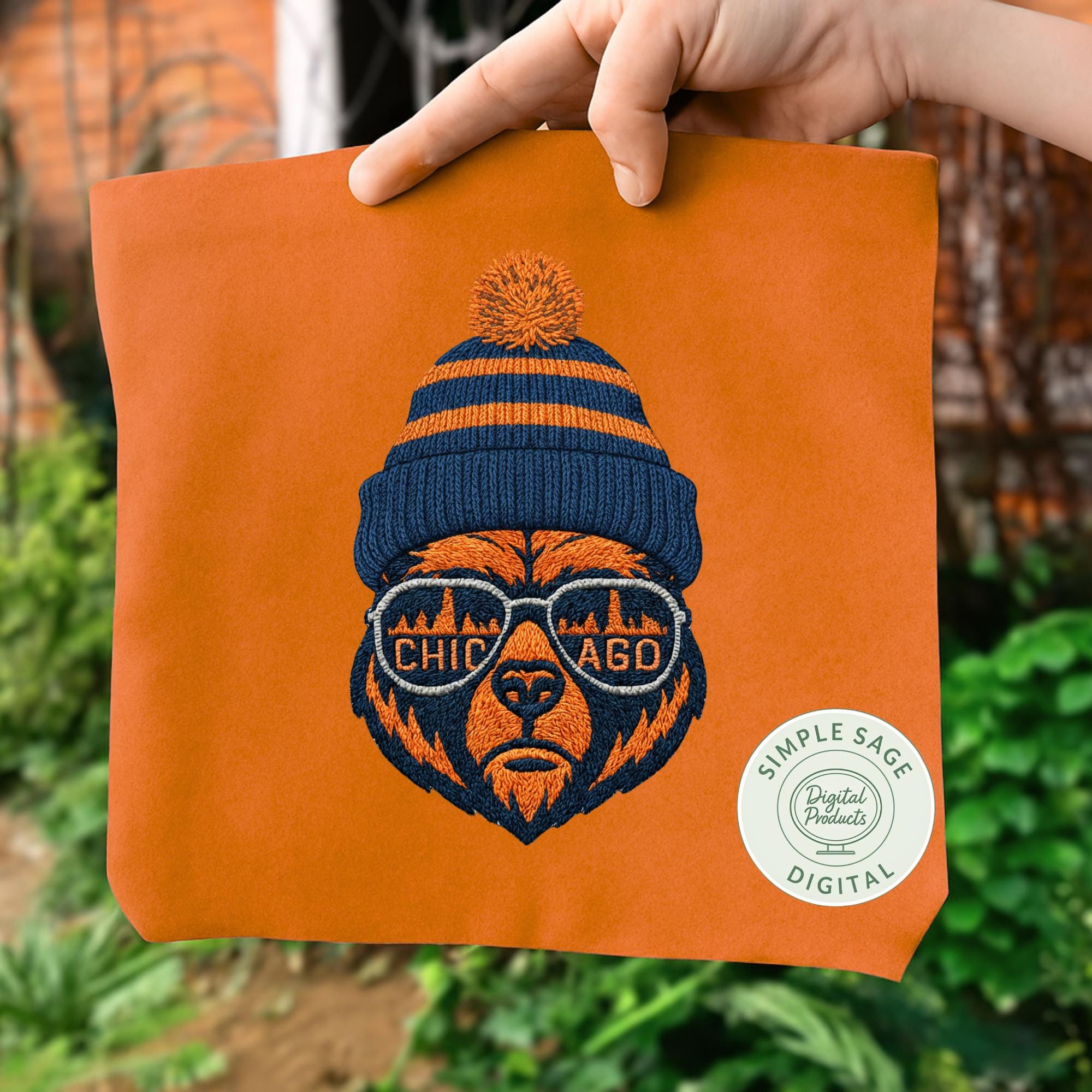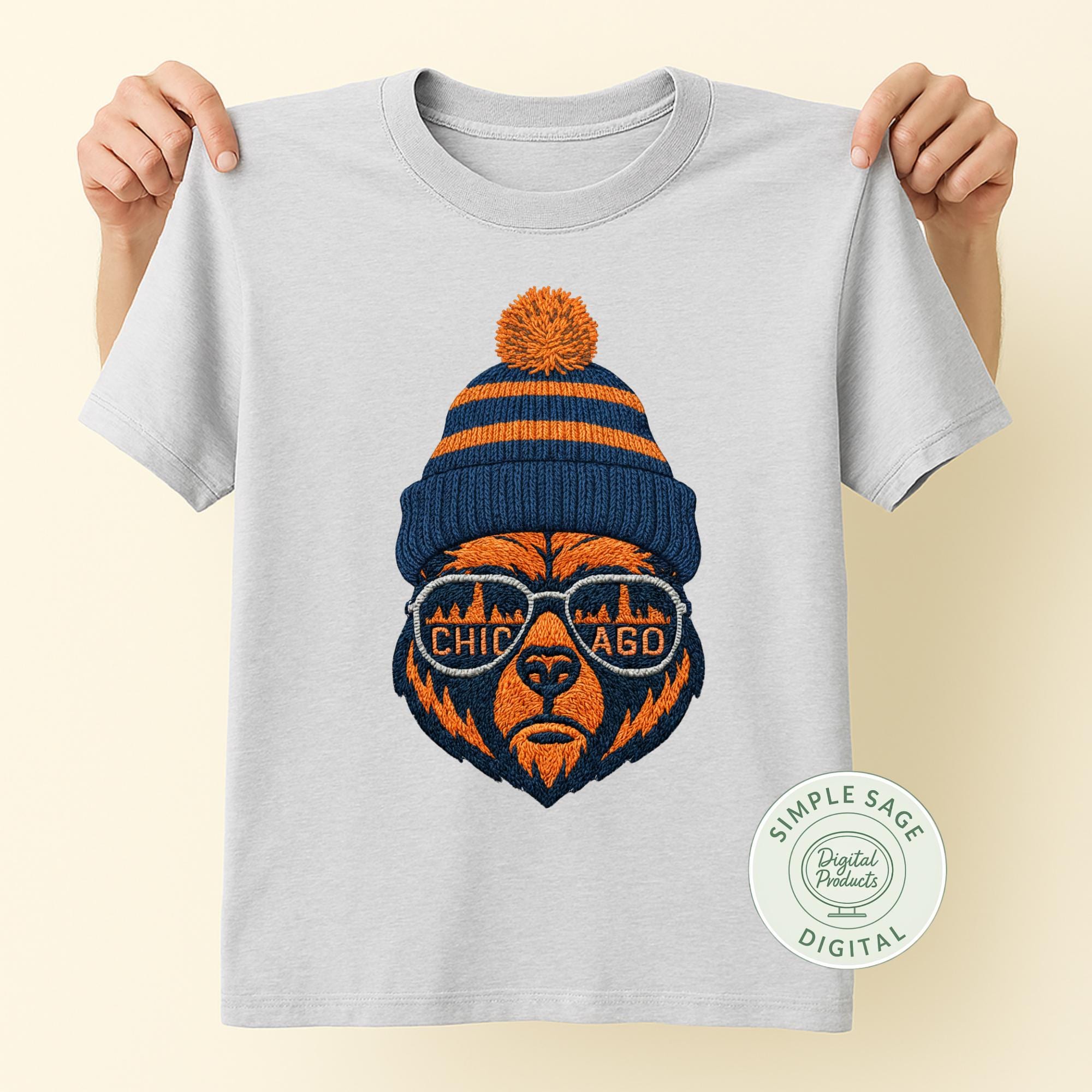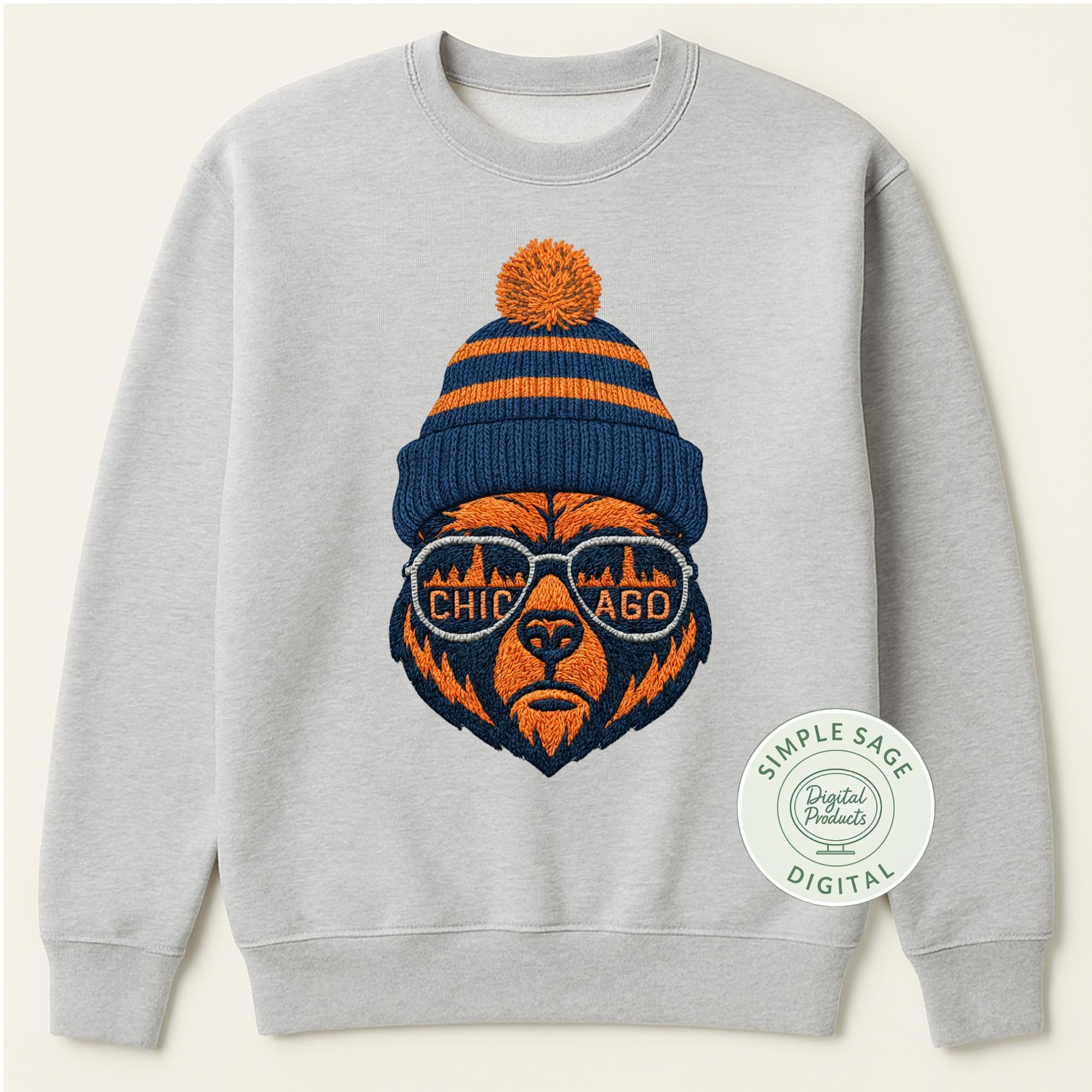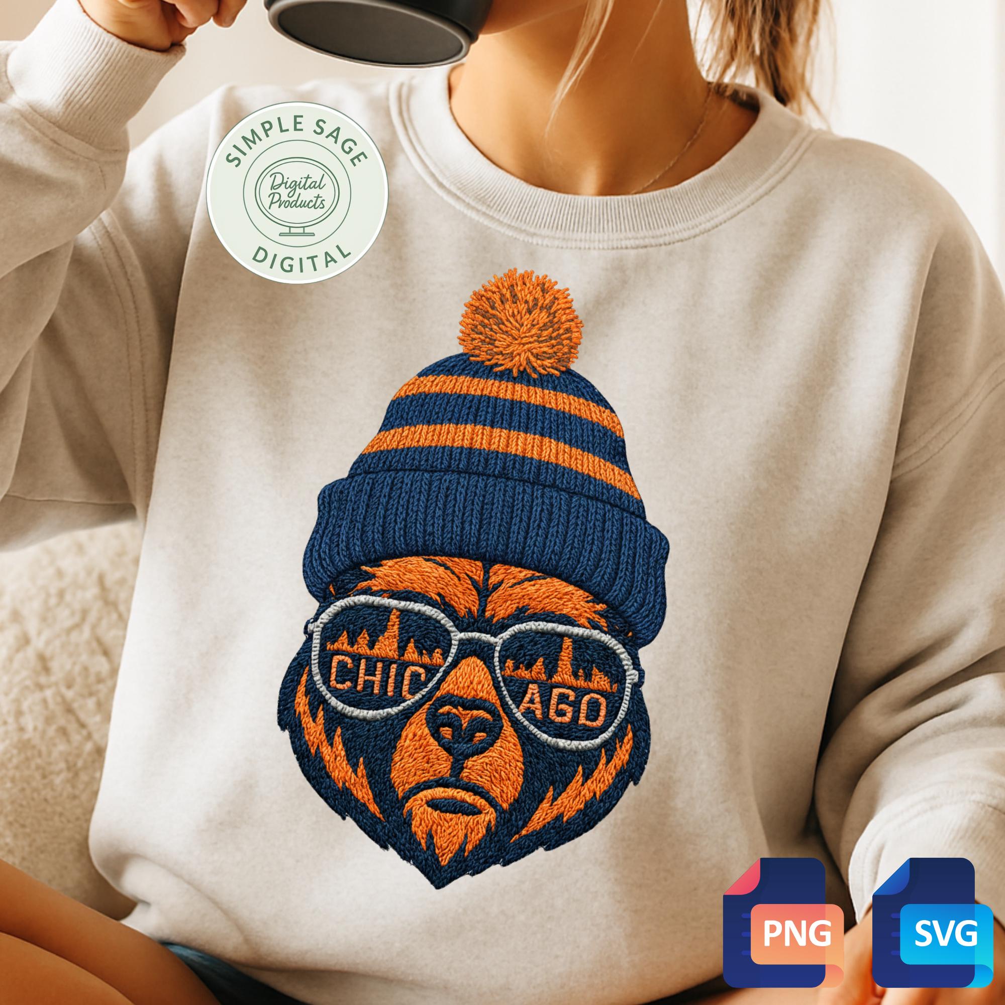 Instantly download this Chicago Bears inspired design featuring a stylized bear head wearing sunglasses that reflect the Chicago skyline. This is an embroidery style PNG/SVG download. Perfect for crafting your own custom apparel, decals, stickers, and more, this high-quality digital art comes in both scalable SVG and PNG formats with transparent backgrounds.